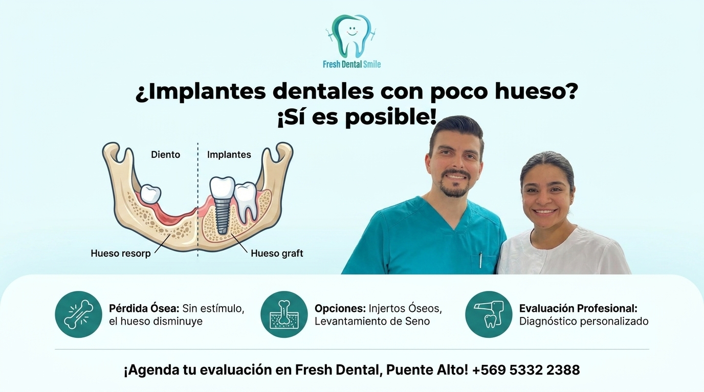 En Fresh Dental, su clínica dental de confianza en Puente Alto, nos especializamos en la rehabilitación oral con implantes dentales. Realizamos evaluaciones personalizadas y exhaustivas, utilizando tecnología de vanguardia como el CBCT para diagnosticar con precisión y determinar las opciones de tratamiento más seguras, efectivas y adaptadas a las necesidades de cada paciente, incluso en casos de pérdida ósea significativa. Nuestro equipo de especialistas está comprometido con devolverle la función, estética y confianza de una sonrisa completa y saludable.